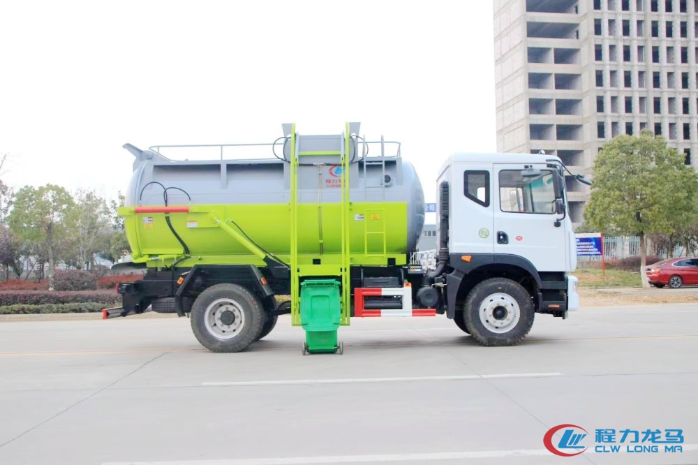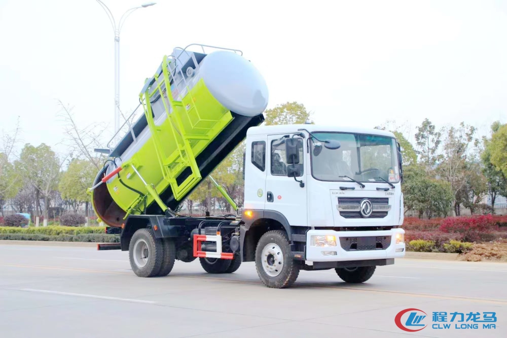 种带举升功能的餐厨垃圾车,卸料方式是罐体举升,打开后盖直接卸料。 第二种不带举升功能车型要加推板,通过内部推板把餐厨垃圾推到尾部,通过蛟龙装置卸料,此方法能保证卸料场地干净卫生。