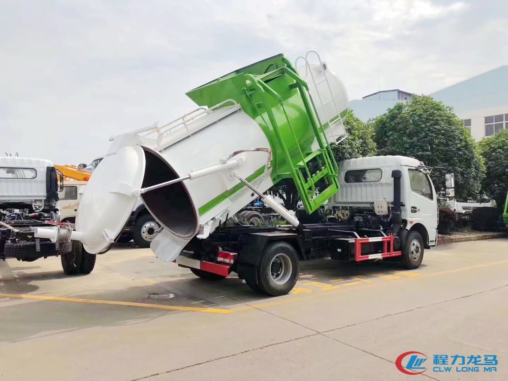种带举升功能的餐厨垃圾车,卸料方式是罐体举升,打开后盖直接卸料。 第二种不带举升功能车型要加推板,通过内部推板把餐厨垃圾推到尾部,通过蛟龙装置卸料,此方法能保证卸料场地干净卫生。