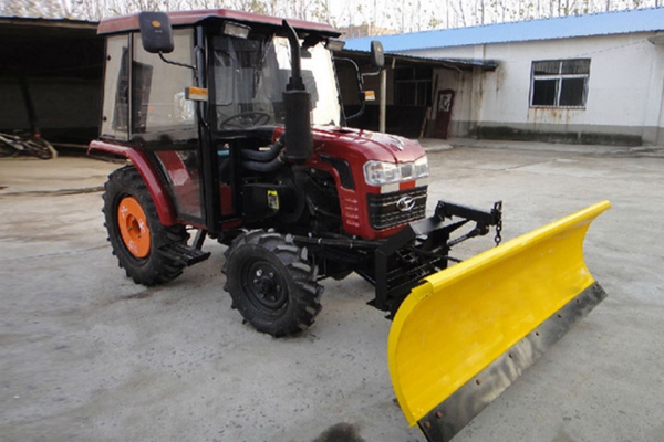借助装载机前进的动力,将雪铲调整至与车辆轴线倾斜30°位置后,利用雪铲的弧度、倾斜角度以及行车速度将积雪快速推至道路边。