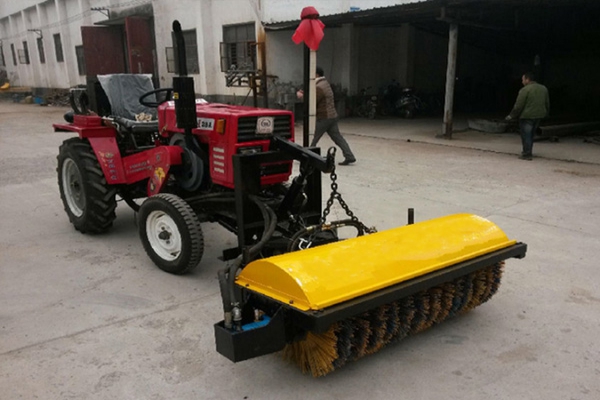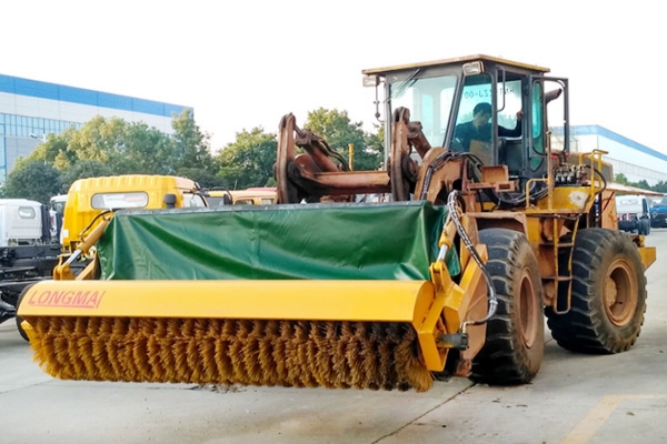 推置式雪滚选用装载机液压动力,将液压动力经管道由控制元件(集成阀)分配到执行元件(大扭矩液压马达和液压缸),从而带动雪滚高速运转工作。通过装载机驾驶室的左右按钮来调节刷子左右摆动,通过调节小臂操纵杆来调节刷子旋转(刷子只允许正转、不能倒转)。雪滚开启前检查外观和各紧固件、液压元件是否正常,工作时通过装载机驾驶室的左右按钮来调节刷子左右摆动。启动装载机液压动力,带动液压泵旋转进行工作,通过液压泵把液压油送进液压阀中,开启左右摆动液压缸使其角度达到使用要求(一般为30o~35o),启动上下液压缸调整雪刷与地面相接触,开启马达控制开关使雪刷旋转,然后装载机行驶达到清扫目的。