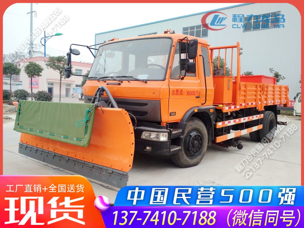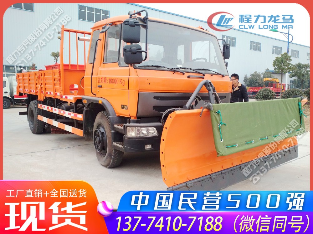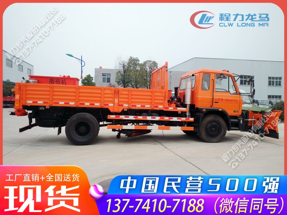 东风153推雪撒布车带中置扫雪滚刷,该车型按用户需求设计定制,前置3.3米推雪铲,货箱里面放置一台融雪剂撒布机用于撒布除雪机融化路面积雪,中间选装小型扫雪滚刷,东风153推雪撒布车的用途是清除道路上的冰雪,广泛使用于高等级公路、城市道路、机场、广场、风景区道路的除雪、融雪、除冰作业,相对于人工除雪,使用机械除雪具有更优的时效性,大幅提高除雪效率,减少人工劳动强度。使用东风153推雪撒布车带中置扫雪滚刷可以在冬季期间投入它们来确保道路上冰雪的清除以及行车的安全。除雪车安装的推雪铲或扫雪滚刷具有越障功能,能够很好的处理各种路面的雪和冰,如浮雪,薄雪,薄冰等,同时它可以在凹凸不平的路面行驶,作业及回避路障,工作效率高。