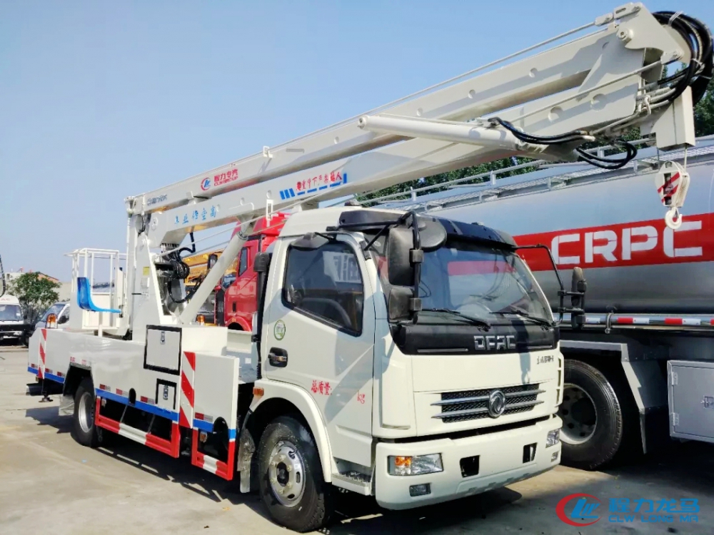 东风大多利卡18米高空作业车采用折叠式曲臂结构,作业臂为三节折叠式,工作斗和转台双工作位,上下操作,液压手动控制,可360度回转,四液压支腿,带1吨吊钩,工作斗大承重200公斤,钢制工具箱及围板、花纹防滑走台板。