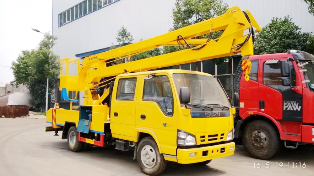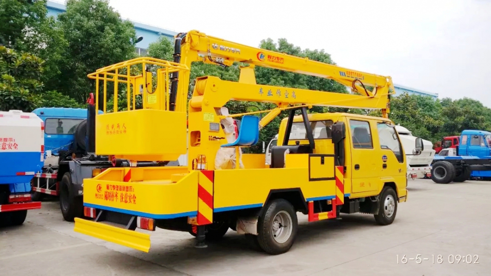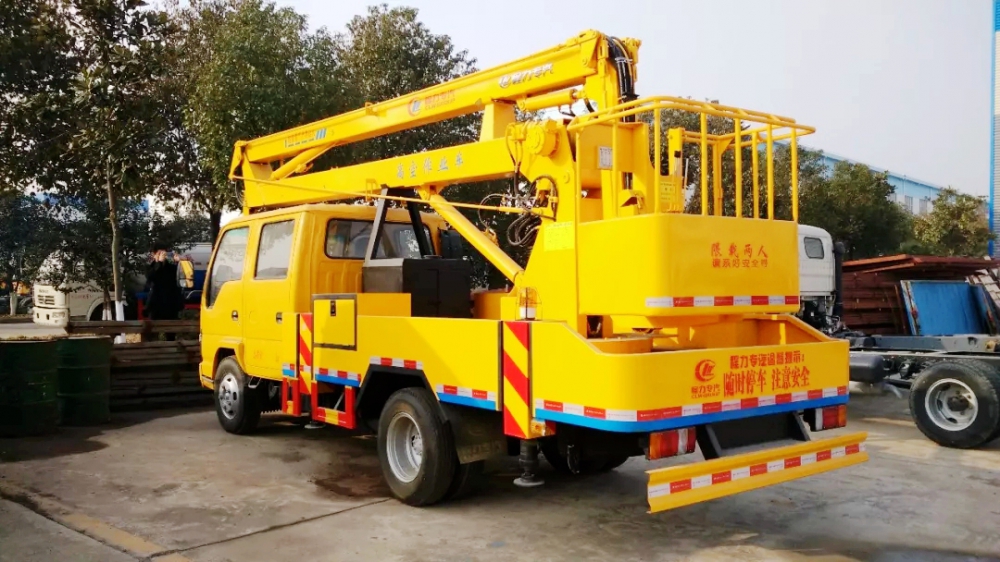 庆铃五十铃高空作业车采用折叠式曲臂结构,作业臂为三节折叠式,工作斗和转台双工作位,上下操作,液压手动控制,可360度回转,四液压支腿,带1吨吊钩,工作斗大承重200公斤,钢制工具箱及围板、花纹防滑走台板。