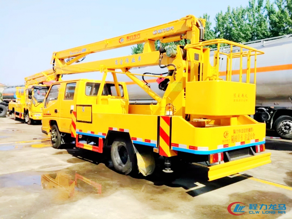 东风凯普特16米高空作业车采用折叠式曲臂结构,作业臂为三节折叠式,工作斗和转台双工作位,上下操作,液压手动控制,可360度回转,四液压支腿,带1吨吊钩,工作斗大承重200公斤,钢制工具箱及围板、花纹防滑走台板。