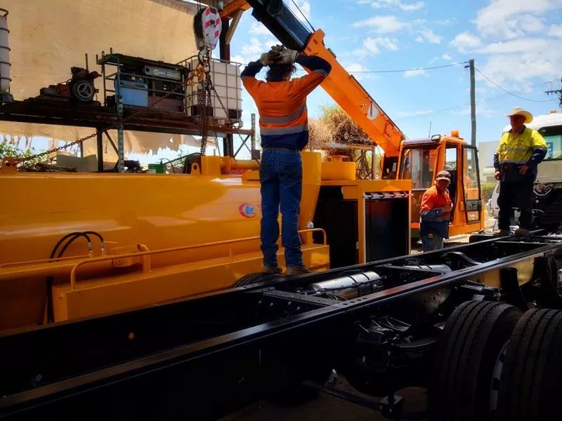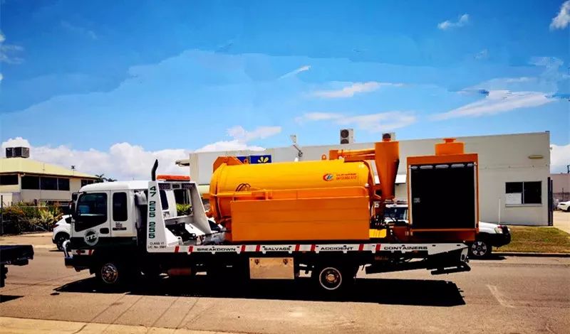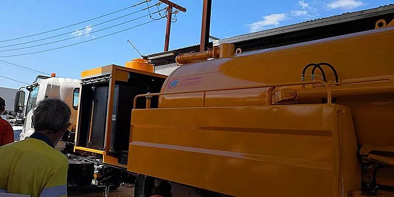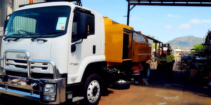 程力环保车专业厂生产的高端智能联合清洗吸污车在澳大利亚汤斯维尔市调试装备。