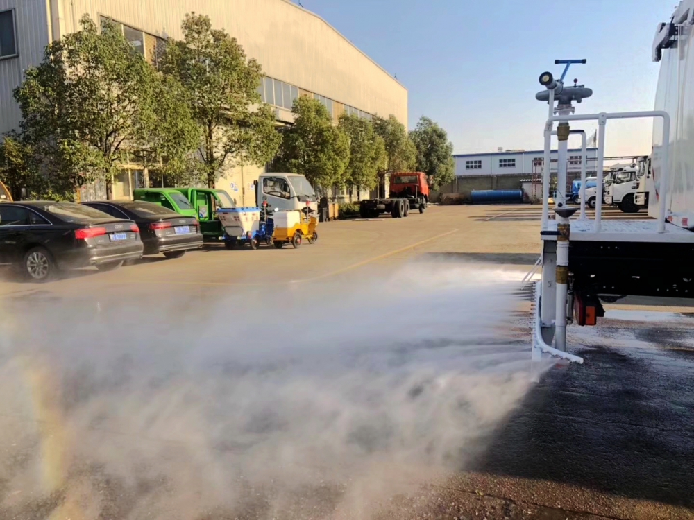 后喷雾系统:车辆尾部功能多样化,罐体尾部顶端安装21个不锈钢高压喷嘴,具有强大的喷雾降尘、喷撒空气消毒剂及调节空气湿度等功能;在车辆尾部下方还装有16个不锈钢常压喷嘴,用于降尘使用,其优点是用水量少,喷洒均匀,可以根据路面状况和水源情况选择后洒水或者后喷雾,这种设计南北方地区都可以适用。