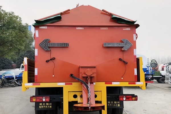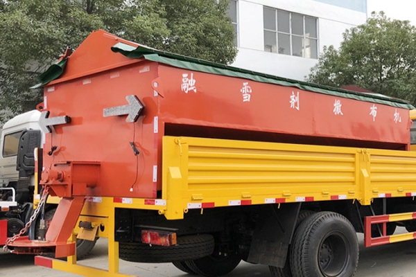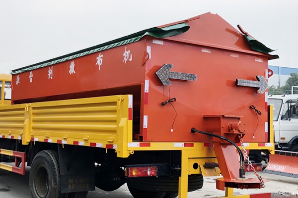 发动机带动导辊旋转,把料箱中的融雪剂输送到撒布斗,通过撒布斗的旋转把融雪剂均匀撒布到路面。