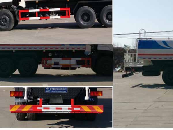 | 其他 | 1,罐体有效容积13.54立方米,罐体外形尺寸(长×长轴×短轴 单位mm): 6500×2200×1400。2,防护材料:Q23碳钢,连接方式:左右侧面及后下部防护均采用焊接连接,后部防护断面尺寸(mm):150×50,后部防护离地高度(mm):500。3,ABS的型号为ABS-E 4S/4M,生产厂家为威伯科汽车控制系统(中国)有限公司。4,安装具有卫星定位功能的行驶记录仪。5,专用装置:罐体,主要用于洒水和园林绿化。6.仅选用4350+1300轴距底盘改装。7.可选装常规后部、选装带弧形喷雾及LED箭头指示灯、选装带LED箭头指示灯、选装带弧形喷雾。8、可选装气柜。9、可选装新款外观。 |