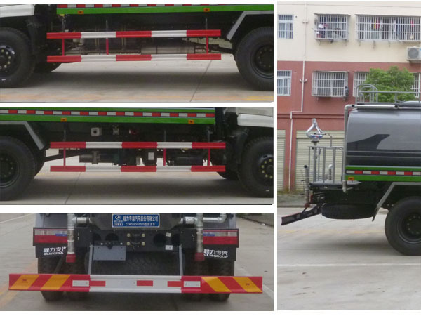 | 其他 | 1,罐体有效容积11.18立方米,罐体尺寸(长×长轴×短轴)尺寸为(mm):4800×2300×1500。2,整车长度(mm)/轴距(mm)/前悬(mm)/后悬(mm)/接近角(°)/离去角(°)的对应关系为:8050/4500/1250/2300/25/13,8250/4500/1450/2300/23/13,8100/4500/1300/2300/25/13,8050/4700/1250/2100/25/14,8250/4700/1450/2100/23/14,8100/4700/1300/2100/25/14。3,防护材料:Q235B碳钢,连接方式:左右侧面防护与副梁均采用螺栓连接,后下部防护与车架采用螺栓连接,后部防护断面尺寸(mm):150×50,后部防护离地高度(mm):500。4,安装具有卫星定位功能的行驶记录仪。5, 选装ABS,ABS的型号可以为ABS-E 4S/4M,生产厂为威伯科汽车控制系统(中国)有限公司。ABS的型号也可以为3631010-C2000,生产厂为东科克诺尔商用车制动系统(十堰)有限公司。6,文字喷图位置和车辆颜色可变化。7,专用装置:罐体,主要用于路面洒水及园林绿化。8,该车可选装:A,后部带弧形喷雾和LED箭头指示灯;B,后部带LED箭头指示灯;C,后部带弧形喷雾装置。9、随底盘选装驾驶室。 |