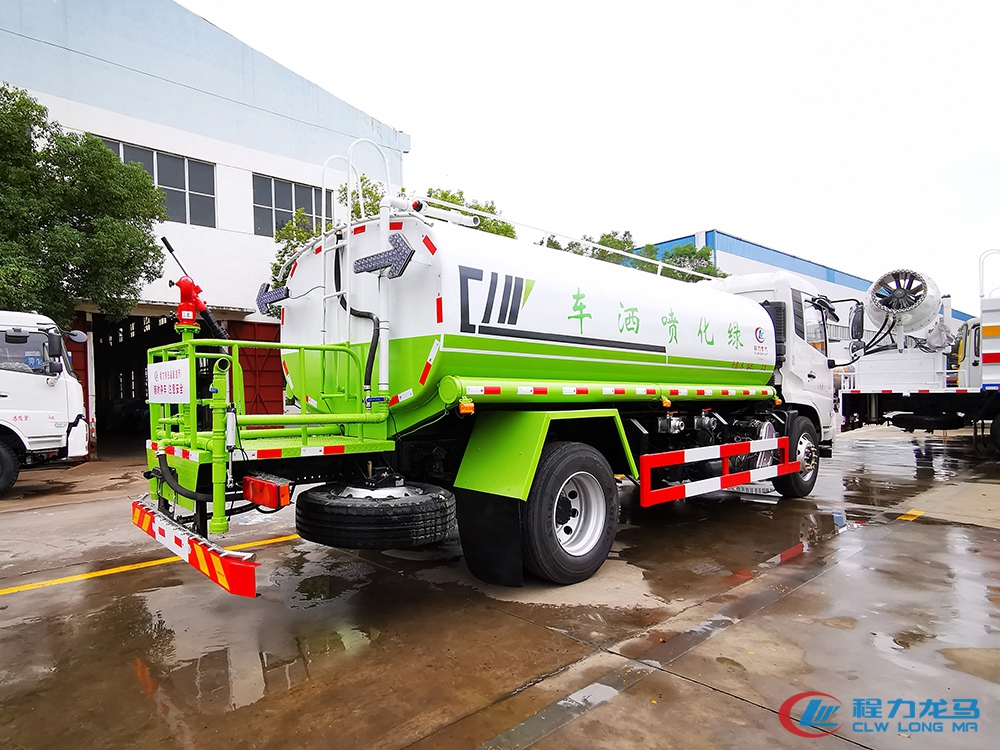 公告水箱总容积10.62立方,由发动机带动变速箱,变速箱上安装的取力器带动洒水泵,洒水泵产生主要动力,将罐体内部的液体通过管网喷洒出去。自吸高度:≤7m,洒水宽度:≥20m,大射程:≥28m;可调节成柱状,射程≥28m;也可调节成雾状,射程≥5m。前喷14米后洒10米,侧喷10米,前装有鸭形喷嘴或圆头冲嘴,后面装有圆柱开洒水喷嘴或莲蓬头喷嘴,后部有一工作平台,装配有高压水炮≥30m。
