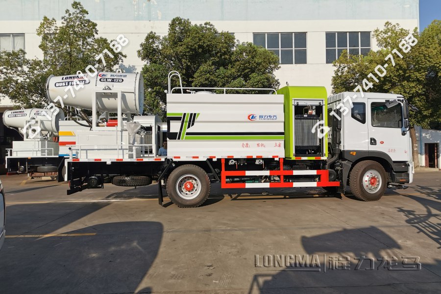 东风康明斯发动机有限公司其它说明 专用装置为抑尘雾炮,用于城市抑尘.整车长/轴距/后悬/后伸对应关系为(mm):8430/3950/2500/720,8630/3950/2500/920,8960/3950/2500/1250,9220/4500/2740/720,9420/4500/2740/920,9750/4500/2740/1250;9950/4700/2740/1250,10250/5000/2740/1250,10550/5300/2740/1250,10850/5600/2740/1250.防护材料:Q23**碳钢,连接方式:左右侧面采用焊接连接,后下部防护采用螺栓连接,后部防护断面尺寸(mm):150×50,后部防护离地高度(mm):450.ABS系统生产厂家,型号 :焦作博瑞克控制技术有限公司,J ABS.当轴距为(3950mm,4500mm,4700mm)时,整备质量为9980kg,当轴距为|(5000mm,5300mm,5600mm)时,整备质量为10500kg.当选装抑尘距离为120米的雾炮时,后伸为1250mm,当选装抑尘距离为80米至100米的雾炮时,后伸为920mm,当选装抑尘距离为60米的雾炮时,后伸为720mm.选装不带颗粒回收器图片. 专用功能 罐体容积 (m³) 10立方 罐体材质 Q235优质碳钢 洒水宽度 (m) ≥14m 绿化洒水炮射程 (m) 柱状≥28m,雾状≥15m 雾炮喷雾机射程 (m) 选配50-100米 配置说明 雾炮机具有自主专利技术,专利号为(201621305361.8 / 201630487869.3),十五年制造经验,产品**通过湖北省及本地质检局检验合格,可根据需求选配不同的射程规格,可远程无线遥控操作作业,采用国内外知名发电机组及风扇电机、电控系统、大功率水泵。抑尘车具有洒水车的**功能:前部冲洗路面喷洒装置、后部扇形降尘喷洒装置,两侧喷洒装置,后部大工作平台、平台上安装绿化洒水炮(炮喷射形状可调),可调直冲状、大雨、中雨、毛毛雨,可连续调节,其它:自流阀及消防接头、水管3米2根,罐体防腐处理。 选装功能 喷雾机可选不锈钢材质,根据车型大小不同可选配一车多用功能,如前置推雪铲、扫雪滚刷、前置高速护栏清洗装置、道路高压清洗装置、墙壁清洗及光伏发电板清洗装置。 行业解决方案 本公司专业生产抑尘车及喷雾机产品,同时可根据场地使用环境定制:多功能抑尘车、铁路专用抑尘车、爆破专用抑尘车、高炮式抑尘车、移动式喷雾机、车载分离式喷雾机,高塔式喷雾机,来电获取专属详细解决方案。 车载式喷雾机主要技术参数(50-100米):