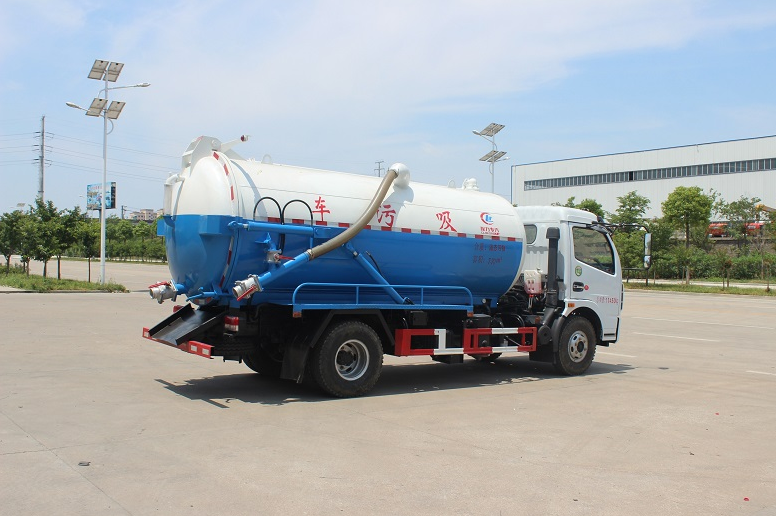 上装配置:专用部分由取力器、传动轴、真空吸污泵、压力罐体、液压部分,管网系统、真空压力表、视粪窗、洗手装置等组成,随车配置大功率真空吸污泵和优质液压系统,罐体封头一次压铸成型、罐体可后开、双顶自卸。罐内污物可通过后盖直接倾倒,具有真空度高(比吸粪车的吸力更大)、吨位大、效率高、用途更广泛等特点。油水分离器,水气分离器,液压自卸装置,专用真空吸污泵,容积压力表,吸物导管,自流阀,真空罐体,连通器(视粪窗),全自动防溢阀,液压套件。采用国内技术的吸污专用泵,吸力大,吸程远,特别适合用于市政环卫,厂区,矿山,小区等下水道内的淤积物的抽吸、装运和排卸,尤其是可吸下水道泥浆、淤泥、石子、砖块等较大物体、含水量较小等物质。抽满污(粪)罐体时间:≤5min,吸程:≥10m。自吸自排,寿命长,工作速度快,运输方便。吸污车与吸粪车具有相同原理,但吸污车又与吸粪车有着不同用途。区别就在于吸污车罐体为圆形罐,结构更紧密,可以耐更高压力提供更大的吸力,可用于收集清理运输污水,污泥。