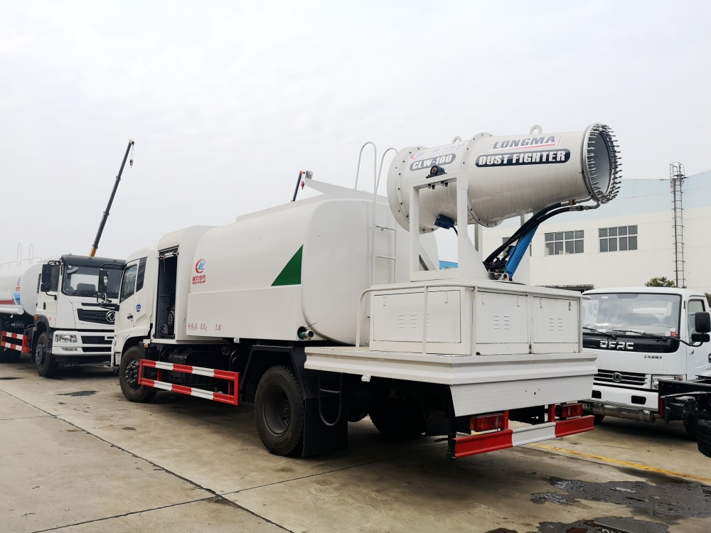 东风天锦抑尘车底盘采用东风天锦国五底盘,康明斯6缸ISB180马力发动机,罐体采用圆弧形方圆罐体,容积可达9立方,罐体内部做防腐,主管路镀锌,发电机组位于车辆中部,后工作平台选装50-100米雾炮机。