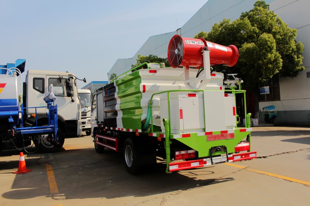 上装配置:罐体容积4.5立方,罐体钢板采用Q235碳钢钢材,前冲后洒、平台高炮、自流阀及消防接头各1个、水管2根,雾炮机可选装30米。
